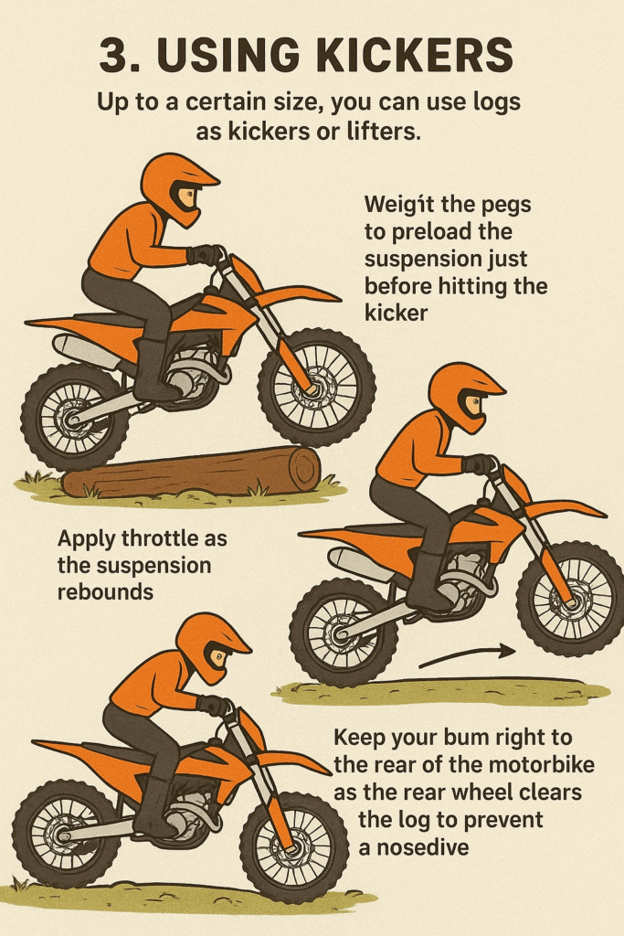 - Keep your bum right to the rear of the motorbike as the rear wheel clears the log to prevent a nosedive.