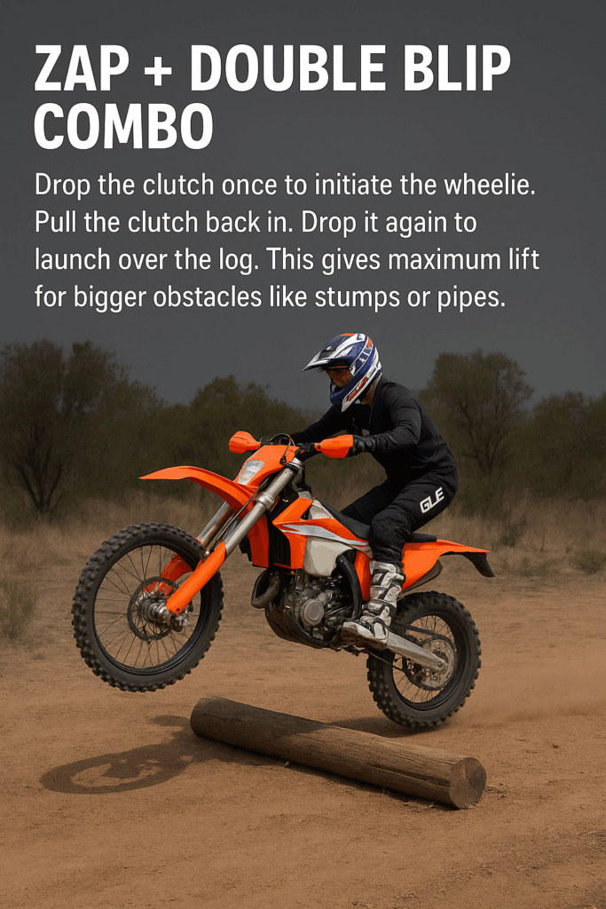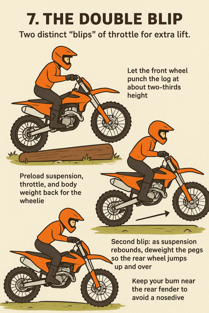 - Second blip: as suspension rebounds, deweight the pegs so the rear wheel jumps up and over.