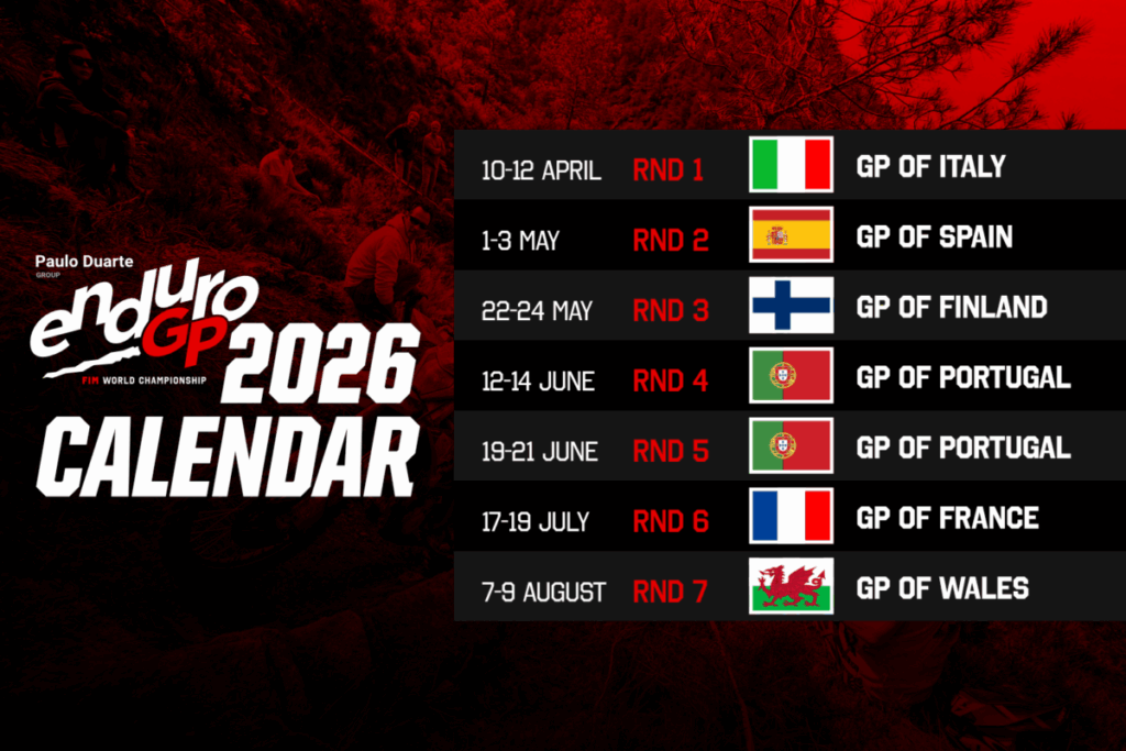 The 2026 Paulo Duarte FIM EnduroGP World Championship provisional calendar schedule has been announced and includes seven rounds from April to August. Italy gets us started in April, and the final make-or-break round has been awarded to Wales next summer.